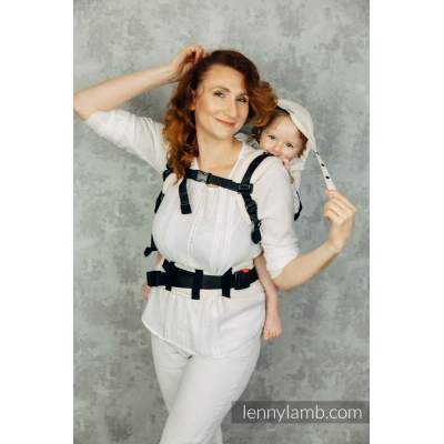 Functionality: two wearing positions - front & back. Adjustment of the panel and the shoulder straps ensure perfect fit and correct, ergonomic position of the child at a