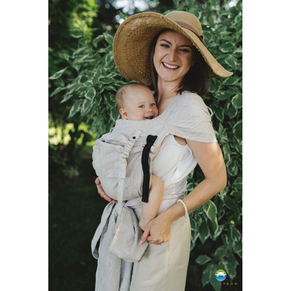 The Little Frog Cross Hybrid (half buckle carrier) is a mix of ergonomic carrier and woven wrap, with a hip belt fastened with a three-point buckle and