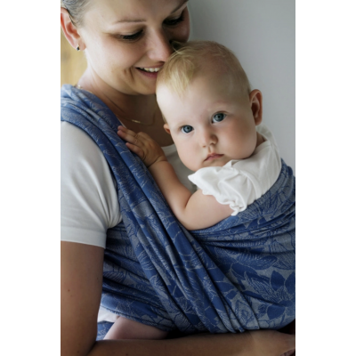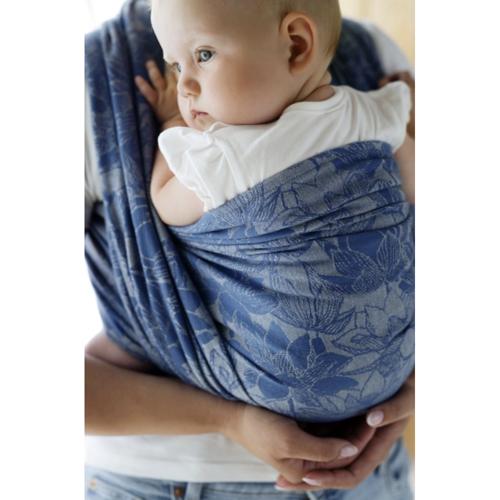 The jacquard weave features a stylish lotus flower pattern in soft blue and natural linen tones, giving this wrap a refined and timeless look. Both edges of the sling are the same color.