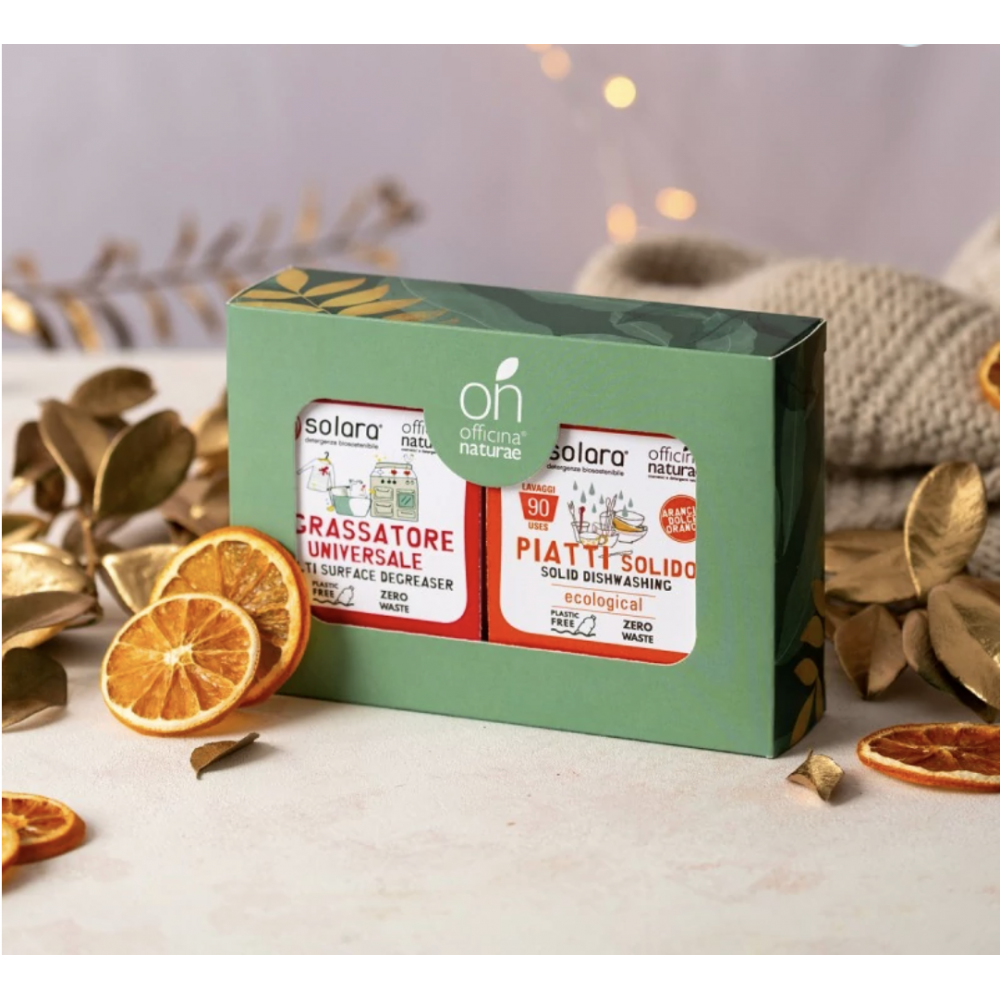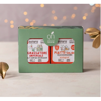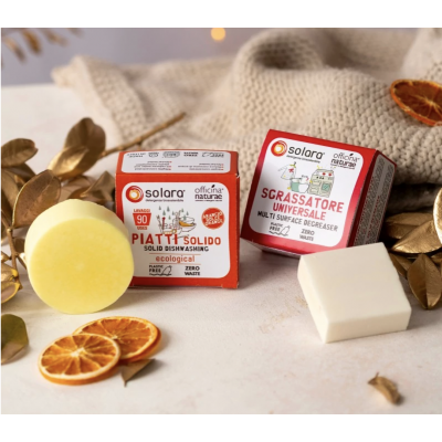 confezionati in plastica. Questa edizione limitata racchiude due detergenti solidi della rinomata linea Solara di Officina Naturae: